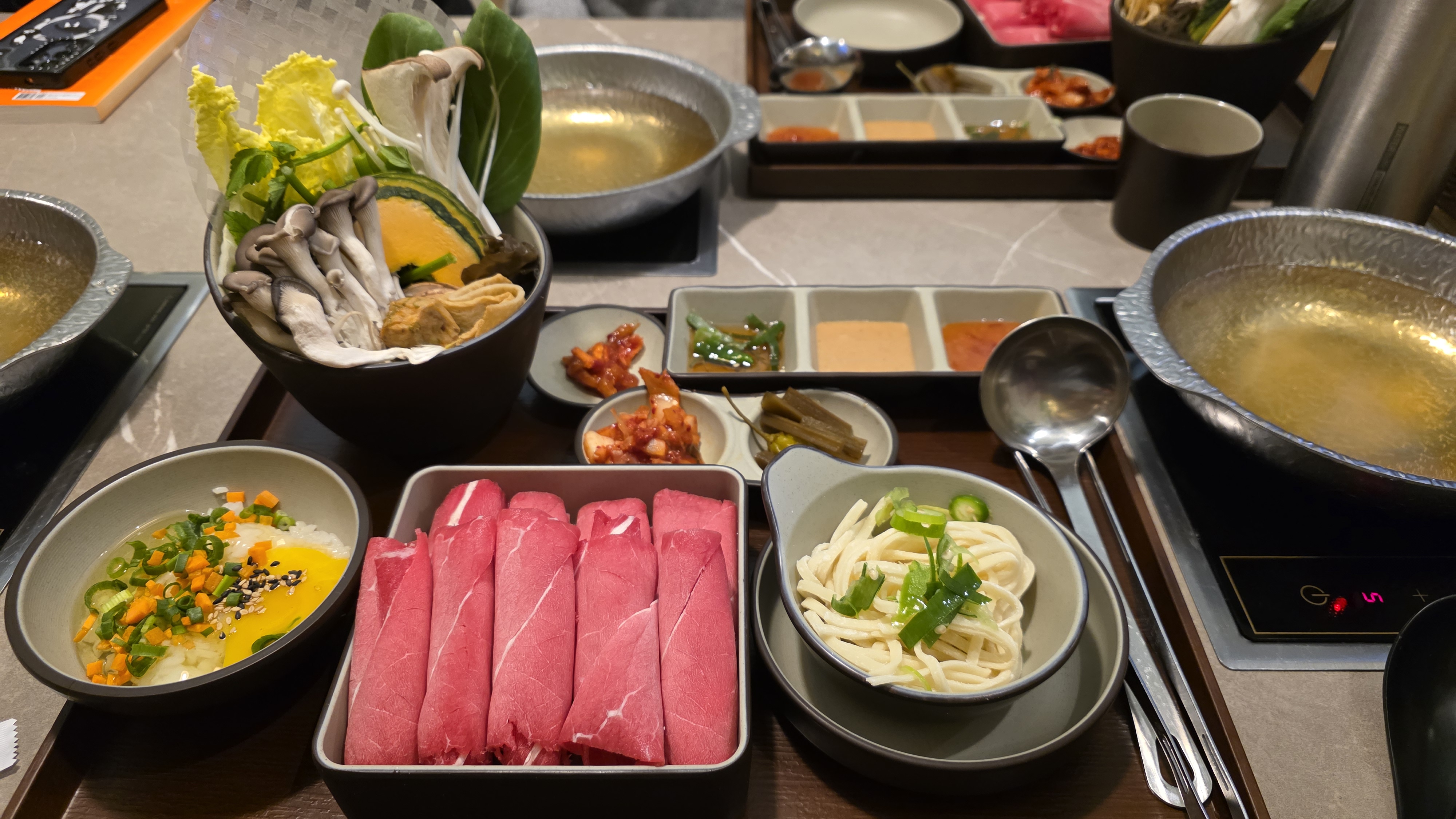 메뉴는 샤브샤브, 편백찜이 있고 1인분씩 각자 냄비에 넣어 먹는 방식으로 나온다